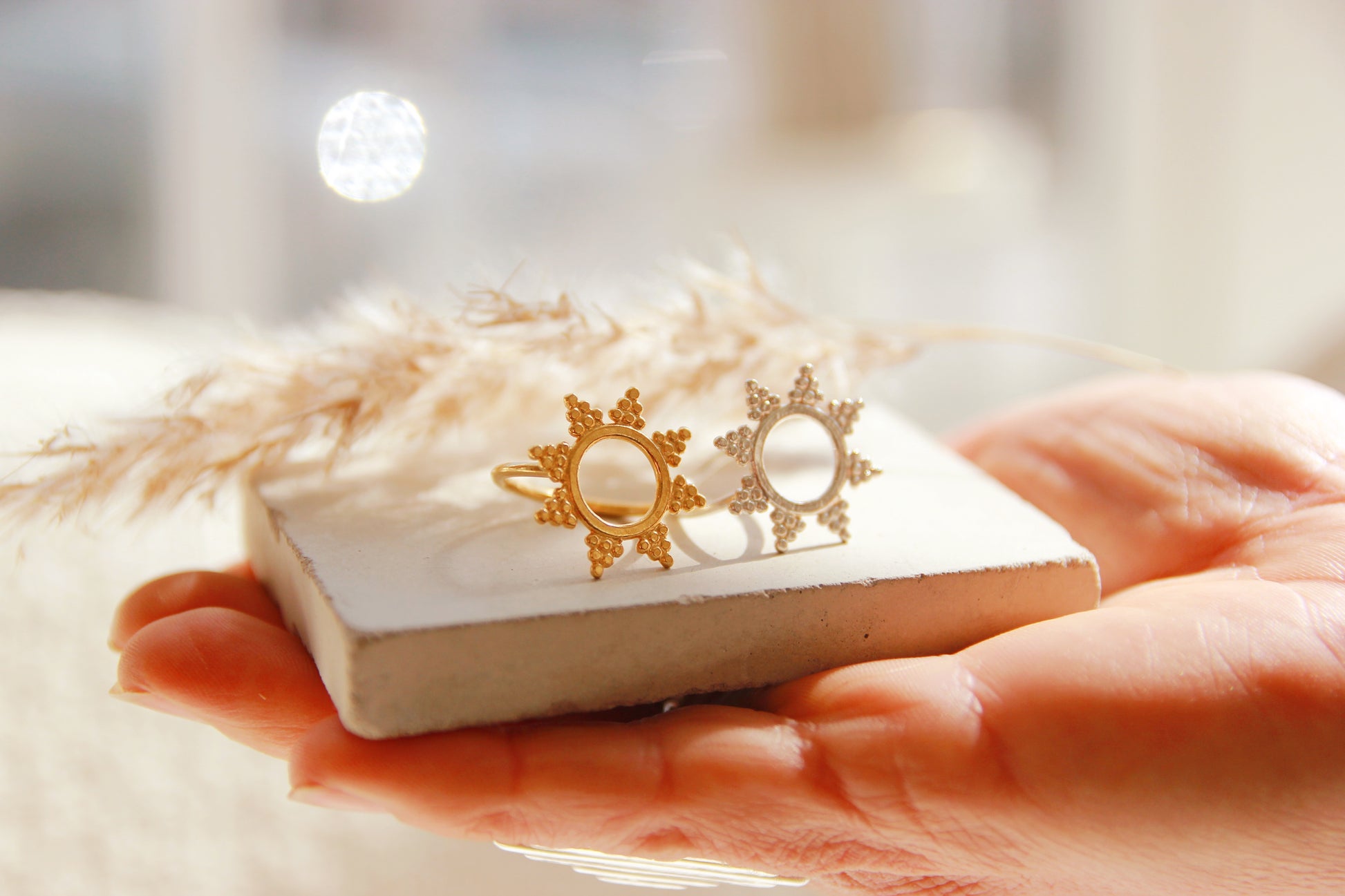 The Aurora Ring is a full circle ring edged with five decorative dot pyramid detail designs, evolved from our now classic dot pyramid collection. The slightly textured surface gives an earthy organic feel to the ring. Handmade to order, this is available in 100% recycled silver or 24ct gold vermeil.