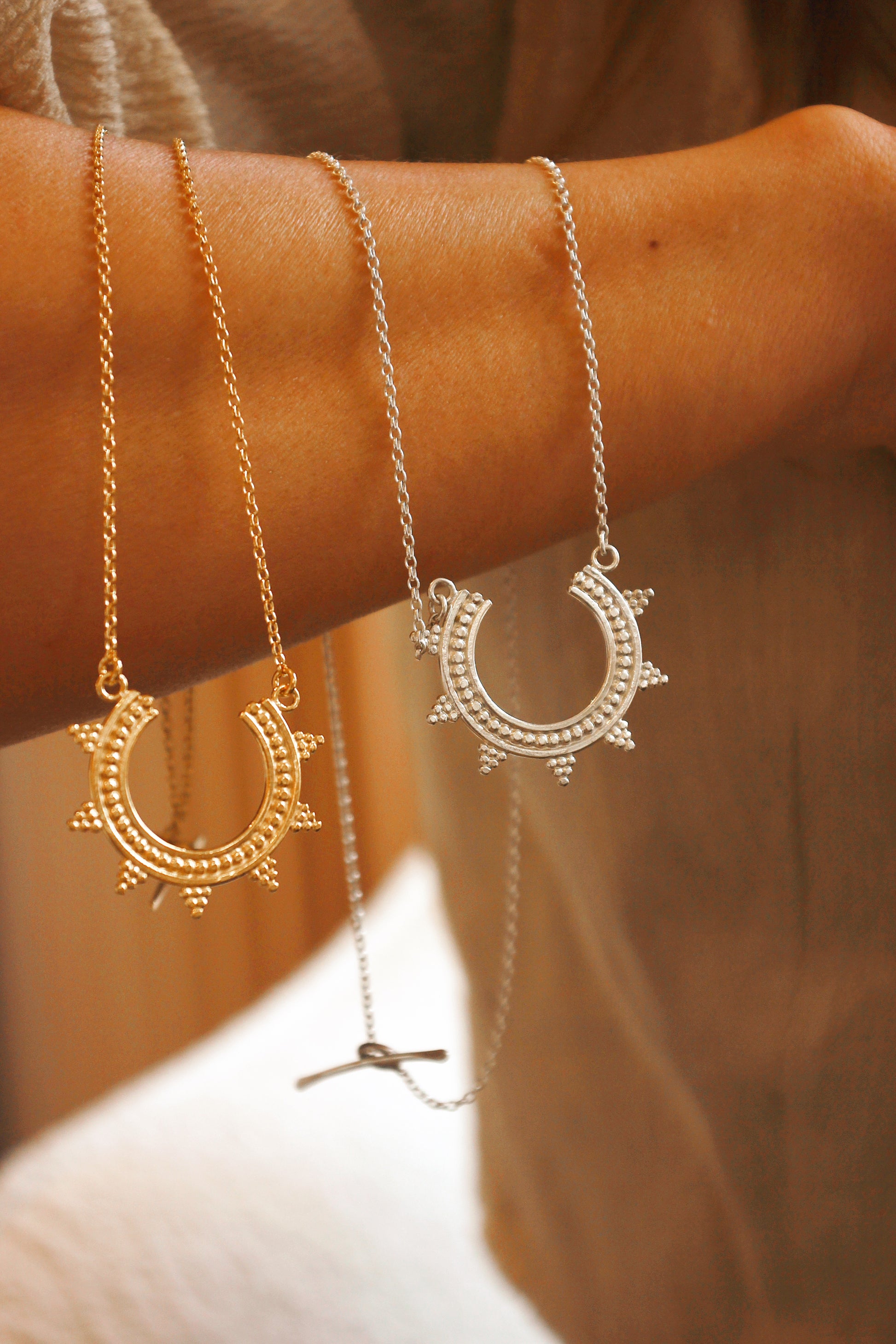 The new hybrid design ‘Meeting at Dawn’ has derived from a meeting of two of Rebecca Furze's classic collections, the Frida and Dawn. This statement necklace features intricately dotted pyramids along a beautifully textured semi circle, which looks lovely framing other pendants, worn alone, or worn with the matching earrings for a bold look. The necklace has a quality heavy weight to it and is available in a wide selection of chain lengths, from a choker length to a statement extra long 30" chain. This stunning necklace is available in your choice of solid 100% recycled silver or 24ct gold plated silver.